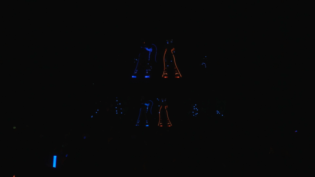 その直後にスクリーンが暗転して一瞬の静寂が訪れた後、暗闇の中でヨミとカスカの衣装の光りが浮かび上がり、会場では再び歓声が上がりました。